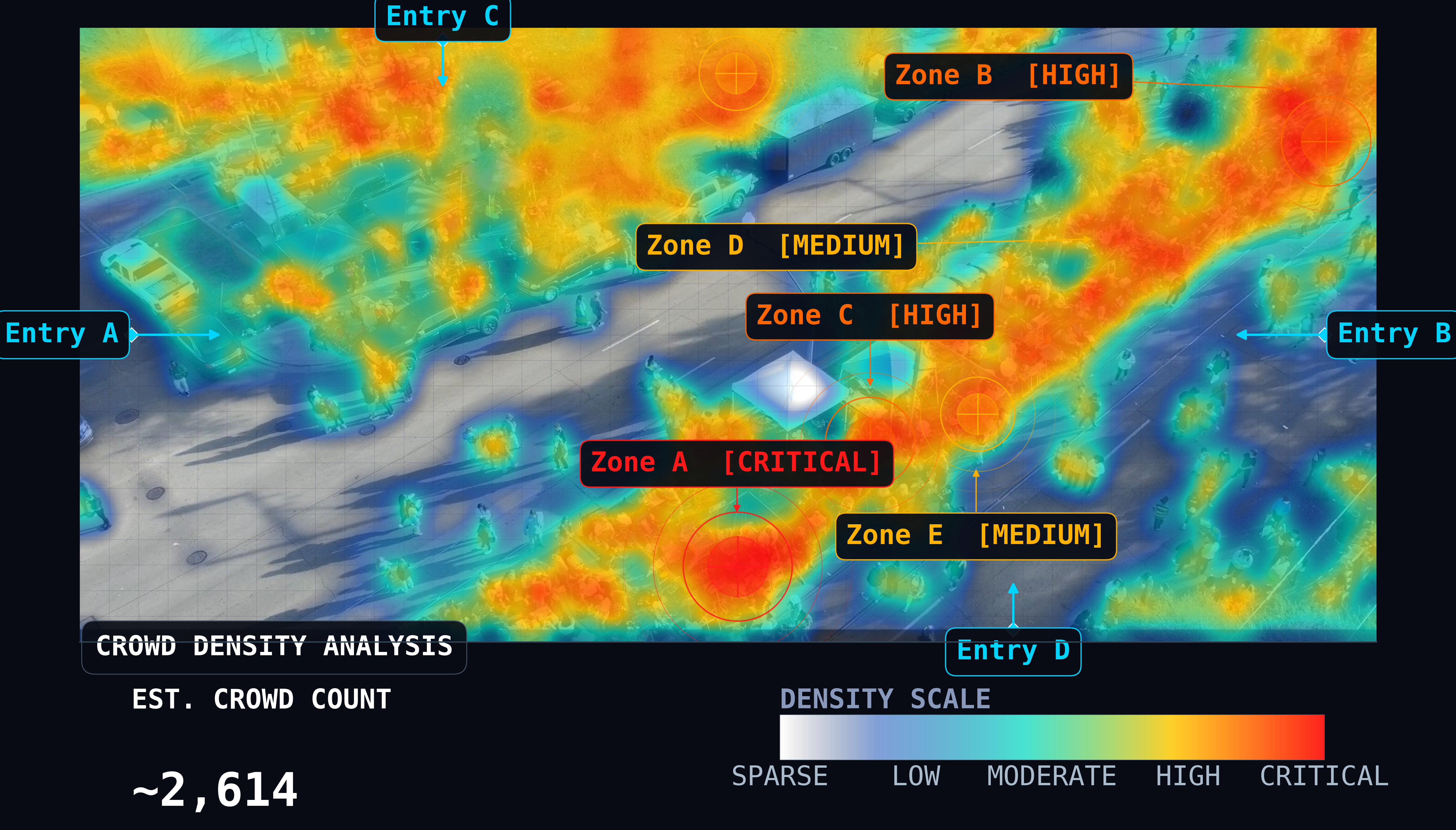Overhead drone views can provide rapid situational awareness for dynamic venues. We structure the operation around command visibility, crowd flow interpretation, and support for on-the-ground response teams.